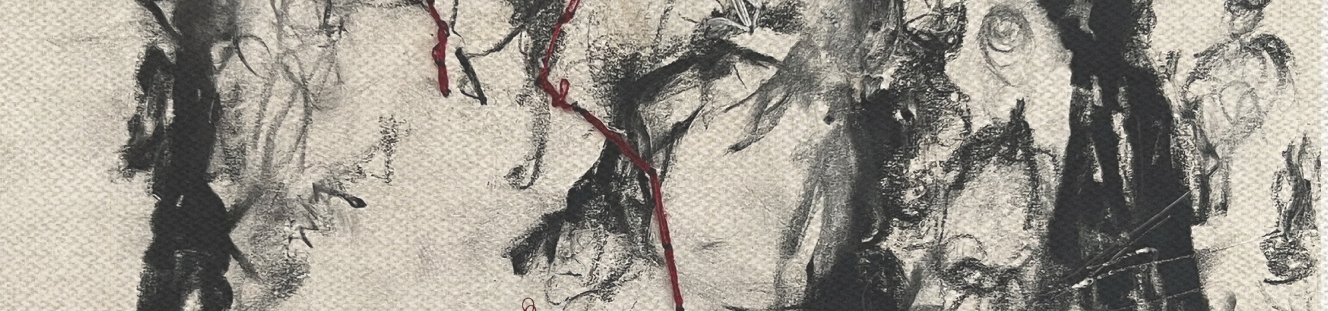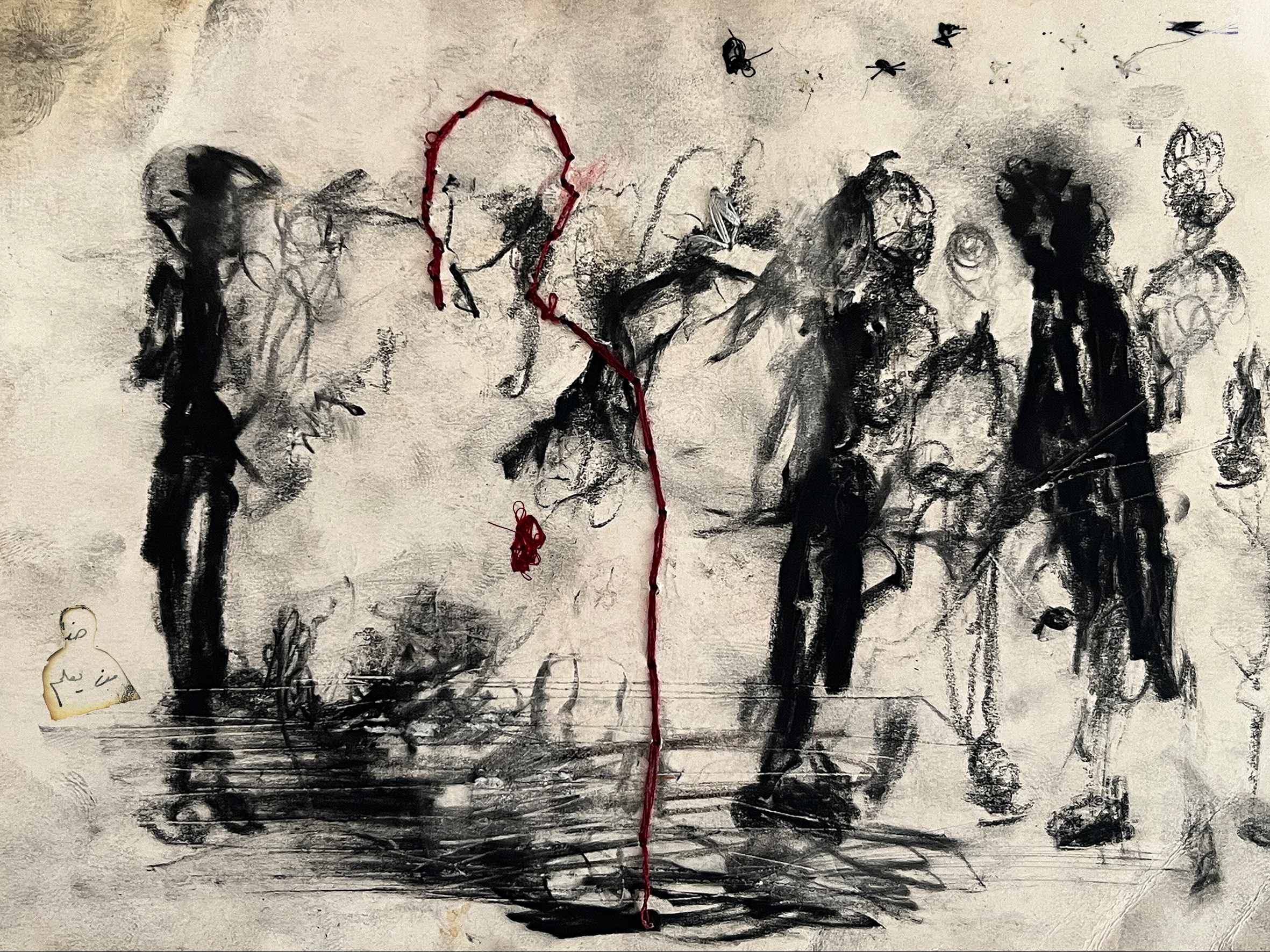 Nour Debian, Untitled, Charcoal, red thread embroidery, and ink on A4 paper (2024).