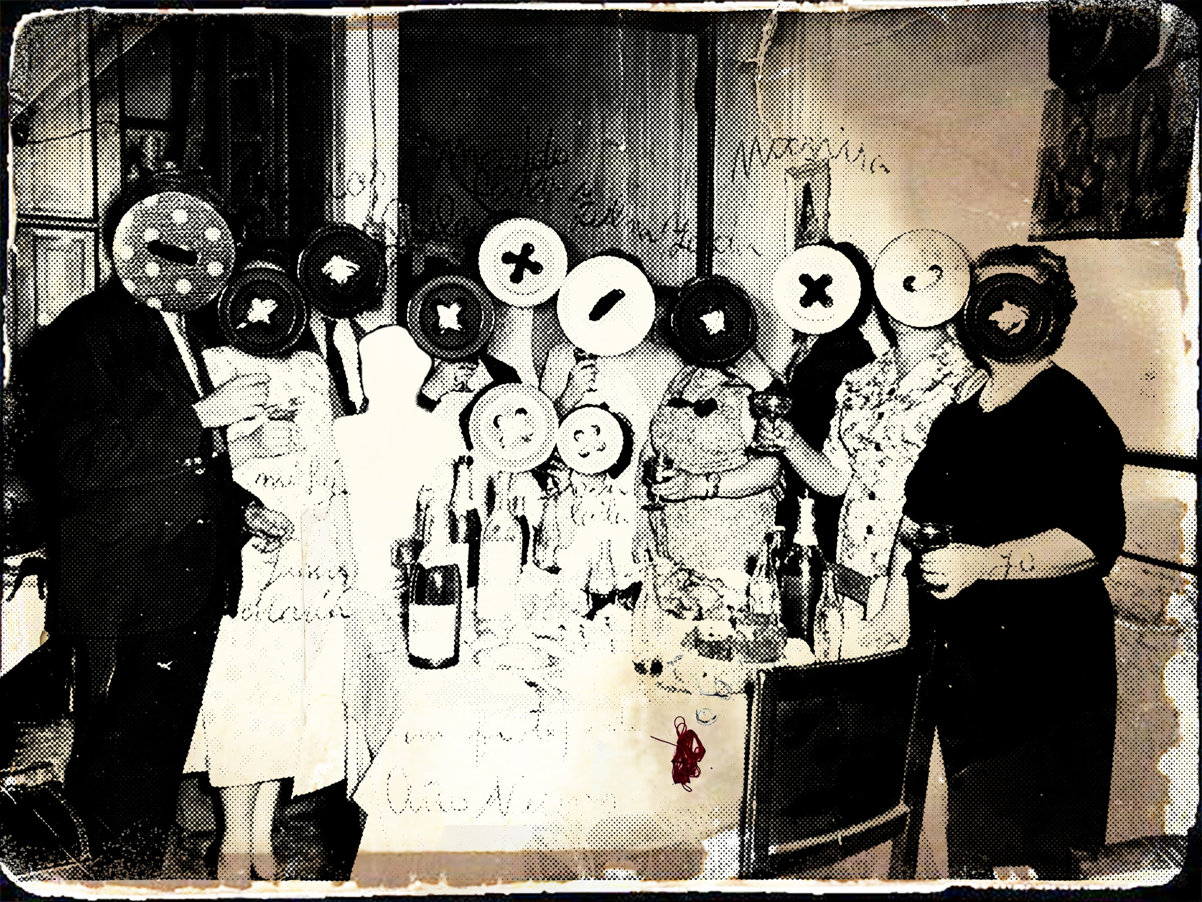 Nour Debian, Everything Will Be Taken Away, sewn dots on found photograph (scanned and re-edited digitally), 10 x 20cm (2024).