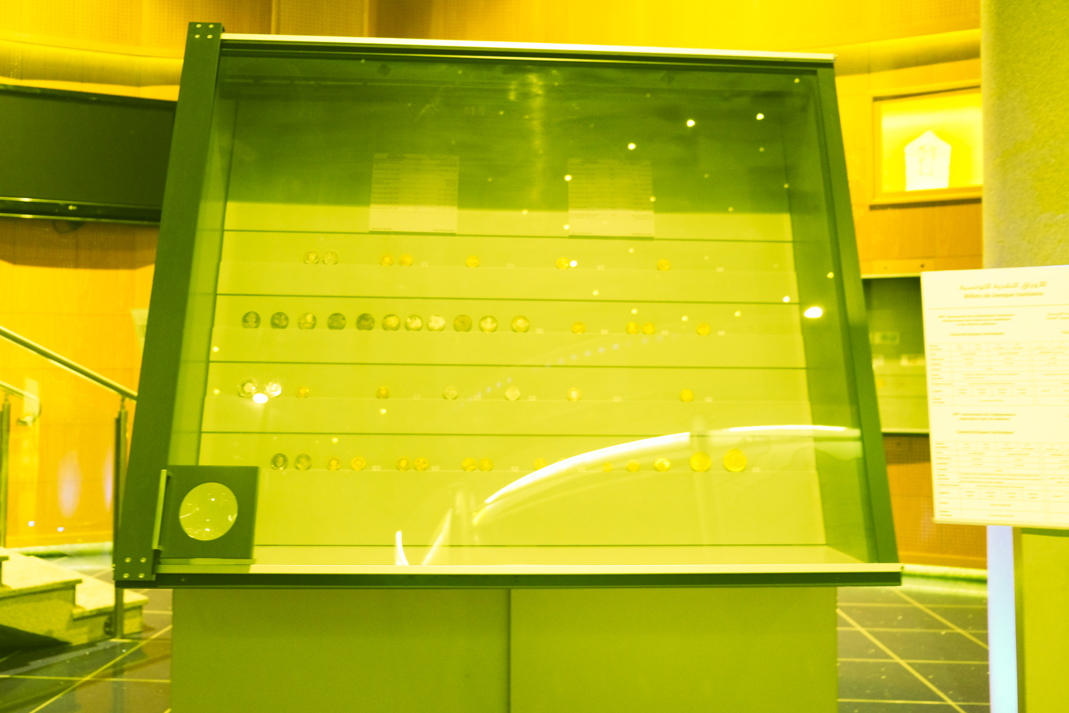 The Museum of Currency is a construction made of concrete on one of Tunis’s largest avenues. The building itself is a sort of small replica of the structure next door, a large eight-floor light beige structure that hosts the Tunisian Central Bank. The Central Bank building looks like a large ship, made of materials that would never float on water and barely keep afloat onshore too. The Museum of Currency, created in 2008, did not shy away from the sea metaphor already implicit in its mother’s structure. The museum is almost all in dark blue tones with matching floors, reminiscent of the high waters, and a blue ceiling dotted with sparkles in a literal interpretation of “night sky dotted with stars.” It is small, its main room and mezzanine saturated with gray showcases that display currencies from the Phoenician era to the banknotes in circulation today. Yet, an entire era is missing. The Ben Ali era. The era of dictatorship. The era the museum was built in. Every banknote of that period has been removed.